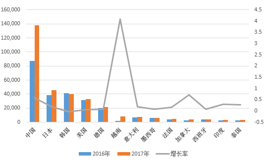 2017年全球各國工業(yè)機器人銷(xiāo)量排名